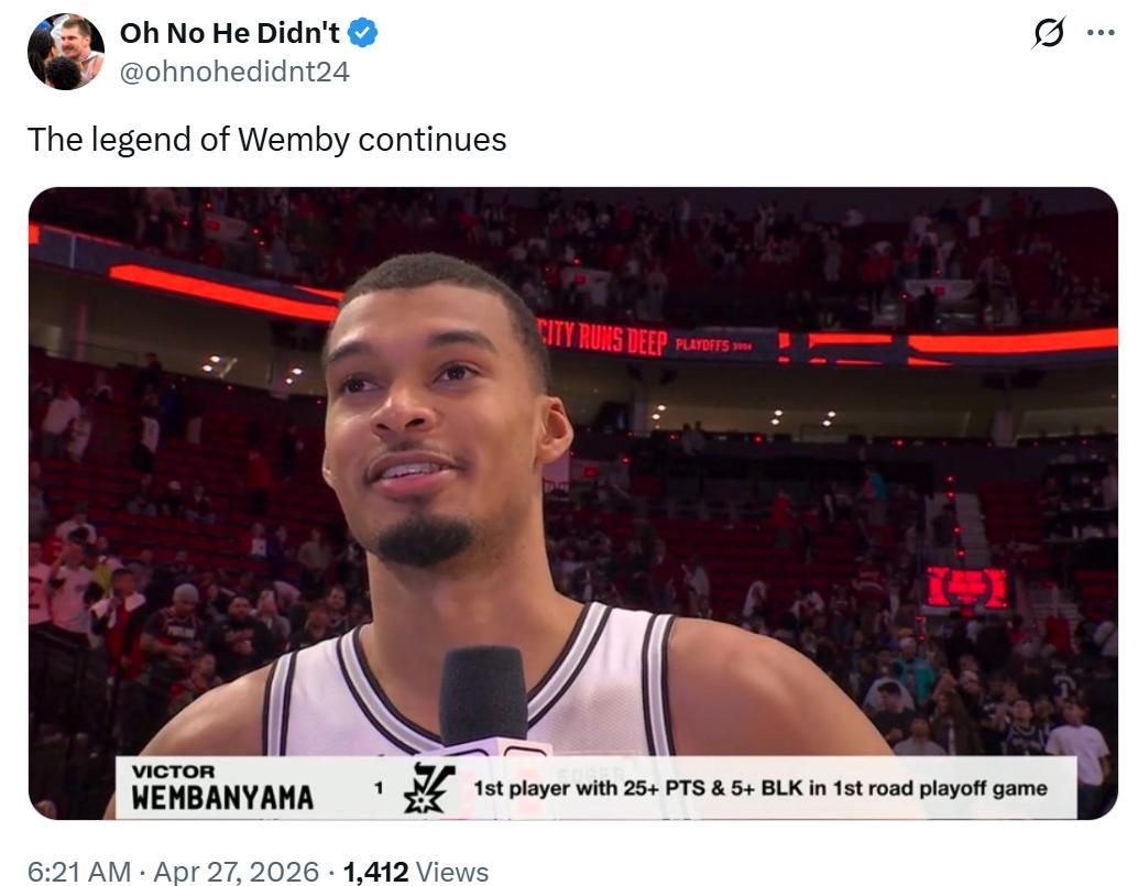 凭借这样的表现,文班亚马成为NBA历史上首位在生涯首场季后赛客场就能至少拿下25分5帽的球员,也成为2003年邓肯之后,首位在季后赛单场至少拿下25分10板,且抢断+盖帽不少于10次的球员。