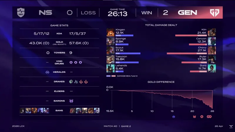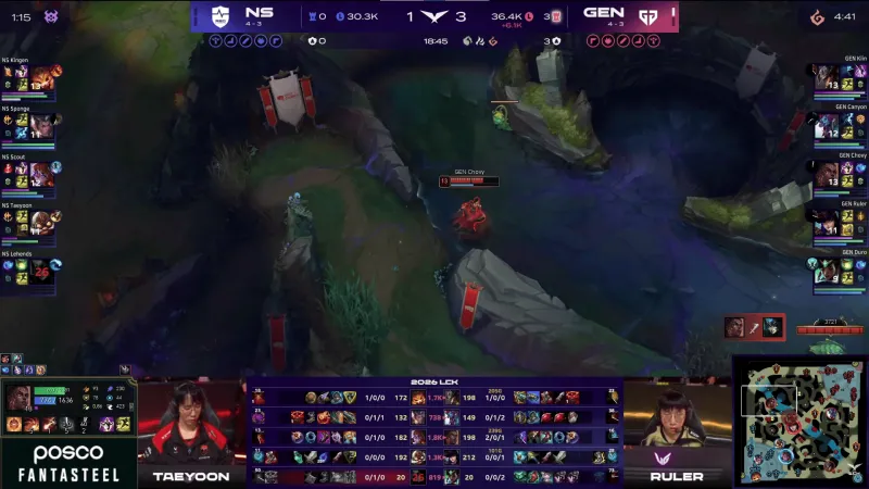 比赛第23分钟,GEN上中双人五杀帮助队伍打出0换5团灭NS,随后GEN拿下龙魂。